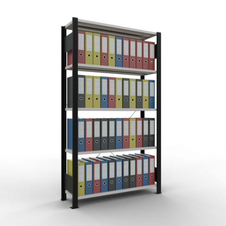 Büroregal aus Metall vom Markenhersteller SCHULTE Lagertechnik. Unser Büroregal steht für den langfristigen Einsatz in Büros, Archiven und Lägern und kann je nach Variante mit, oder ohne Anschlagleisten und Mittelanschläge geliefert werden. Das hier angebotene Büroregal Grundregal mit der Artikelnummer 36019-S wird in 1800 mm Höhe, 1000 mm Breite und 300 mm Tiefe geliefert. Es ist mit 5 Fachebenen ausgestattet und kann je Ebene mit 85 kg belastet werden. Die Ebenen sind ohne Anschlagleisten ausgestattet. Um den langfristigen Einsatz zu gewährleisten werden die einzelnen Bauteile in der Farbe schulte-schwarz/lichtgrau.