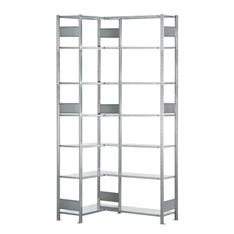 Eckregal aus Metall vom Hersteller SCHULTE Lagertechnik in bewährter Qualität. Das SCHULTE Lagertechnik Eckregal "Feld A&B" bietet die Möglichkeit, den vorhandenen Lagerraum sprichwörtlich bis in die letzte Ecke auszunutzen. Es wird in den Abmessungen 3000x1000x400 mm (HxBxT) geliefert und ist mit 2x7 Fachebenen ausgestattet. Jede der 2x7 Fachebenen kann mit 150 kg belastet werden. Sollten Sie in diesem Schwerlastregal mehr als 2x7 Fachebenen benötigen, finden Sie unter dem Punkt "Passendes Zubehör" die passenden Zusatzebenen.