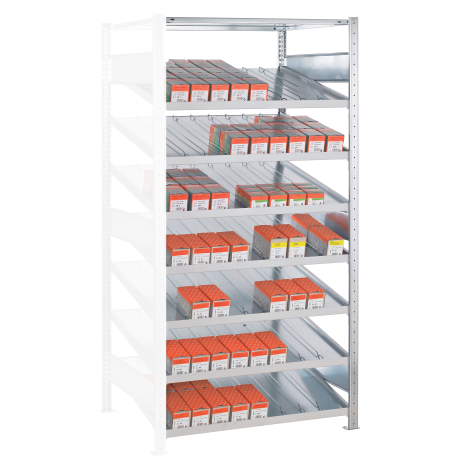 Die einzelnen Fachböden können im Raster von 25 mm in der Höhe verstellt werden. Sollte die angegebene, gleichmäßig verteilte Fachlast i.H.v. 150 kg je Fach nicht ausreichen, können Sie die Fachböden mit Verstärkungsunterzügen ausstatten und so die Tragkraft erhöhen.