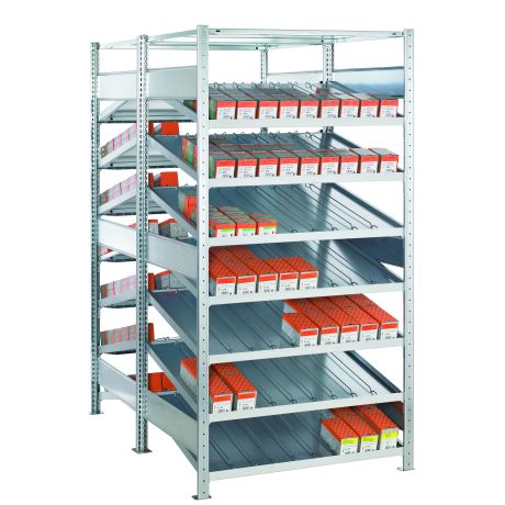 Kanbanregal vom Markenhersteller SCHULTE Lagertechnik. Das Kanbanregal ist das wohl bekannteste Schwerlastregal mit schrägen Ebenen und wird oftmals, in Lagern, an Produktionslinien, oder in Schraubenlagern verwendet. Das hier angebotene Kanbanregal Grundregal mit der Artikelnummer 13652 wird in 2000 mm Höhe, 1000 mm Breite und 800 mm Tiefe geliefert. Es ist mit 2x8 Fachebenen ausgestattet und kann je Ebene mit 150 kg belastet werden. Die Fachebenen sind Mit Trenn- & Seitenführung ausgestattet.
