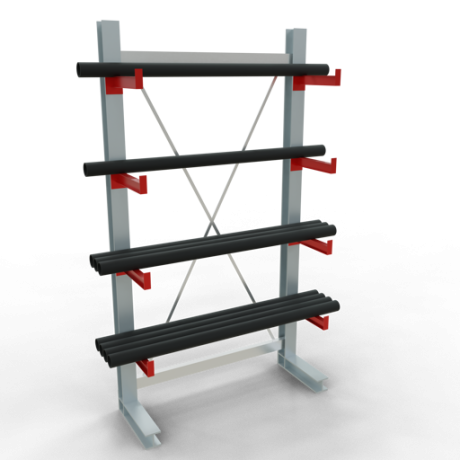 Kragarmregal ist mit mehreren stabilen Lagerebenen ausgestattet und eignet sich perfekt für die Lagerung von Rohren, Profilen, Leisten, Stahl- oder Holzstangen sowie anderen sperrigen Materialien. Dank der einseitigen Bauweise lässt es sich besonders gut entlang von Wänden oder an Arbeitsbereichen mit geringem Platzbedarf aufstellen.