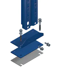 Fußplatten und Unterlegbleche bilden das Fundament eines Palettenregal-Ständerrahmens. Sie werden ganz einfach mit zwei M10 × 25 mm-Schrauben unter dem Ständerprofil befestigt und sorgen für einen sicheren Stand. Die Materialstärke beträgt 5 mm.