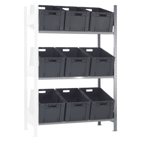 Schrägbodenregal Anbauregal 2000x1000x600 mm, verzinkt/RAL 7035 lichtgrau, 150 kg Fachlast, 3 Fachböden, T-Profil Ständerrahmen MULTIplus vormontiert