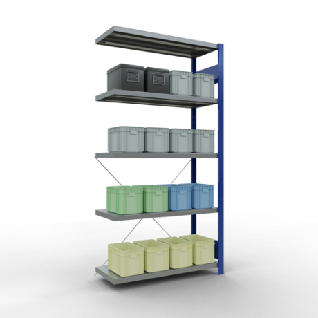 Schwerlastregal vom Markenhersteller SCHULTE Lagertechnik. Das Schwerlastregal vom Typ MULTIplus ist das wohl bekannteste Steckregal auf dem deutschen Markt und wird oftmals, in Lagern, an Produktionslinien, in Archiven, oder auch in privaten Haushalten verwendet. Das hier angebotene Schwerlastregal Anbauregal mit der Artikelnummer 12945-B-M wird in 2000 mm Höhe, 1000 mm Breite und 400 mm Tiefe geliefert. Es ist mit 5 Fachebenen ausgestattet und kann je Ebene mit 250 kg belastet werden. Um die langfristige Nutzung zu gewährleisten sind die Bauteile in der Farbe RAL 5010 enzianblau/verzinkt. Das Schwerlastregal ist für die Einseitige Bedienung ausgelegt.