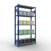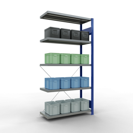 Schwerlastregal vom Markenhersteller SCHULTE Lagertechnik. Das Schwerlastregal vom Typ MULTIplus ist das wohl bekannteste Steckregal auf dem deutschen Markt und wird oftmals, in Lagern, an Produktionslinien, in Archiven, oder auch in privaten Haushalten verwendet. Das hier angebotene Schwerlastregal Anbauregal mit der Artikelnummer 13945-B-M wird in 2000 mm Höhe, 1000 mm Breite und 400 mm Tiefe geliefert. Es ist mit 5 Fachebenen ausgestattet und kann je Ebene mit 330 kg belastet werden. Um die langfristige Nutzung zu gewährleisten sind die Bauteile in der Farbe RAL 5010 enzianblau/verzinkt. Das Schwerlastregal ist für die Einseitige Bedienung ausgelegt.