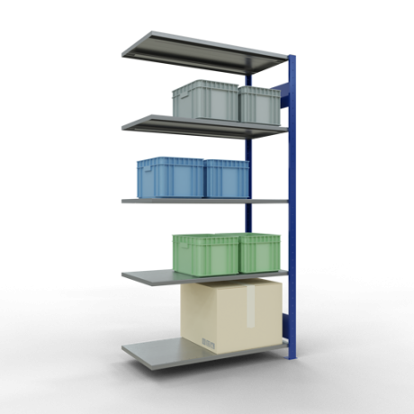 Schwerlastregal vom Markenhersteller SCHULTE Lagertechnik. Das Schwerlastregal vom Typ MULTIplus ist das wohl bekannteste Steckregal auf dem deutschen Markt und wird oftmals, in Lagern, an Produktionslinien, in Archiven, oder auch in privaten Haushalten verwendet. Das hier angebotene Schwerlastregal Anbauregal mit der Artikelnummer 13155-LR-B wird in 2000 mm Höhe, 1000 mm Breite und 500 mm Tiefe geliefert. Es ist mit 5 Fachebenen ausgestattet und kann je Ebene mit 85 kg belastet werden. Um die langfristige Nutzung zu gewährleisten sind die Bauteile in der Farbe RAL 5010 enzianblau/verzinkt. Das Schwerlastregal ist für die Beidseitige Bedienung ausgelegt.