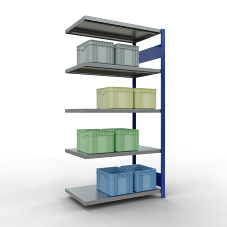 Schwerlastregal vom Markenhersteller SCHULTE Lagertechnik. Das Schwerlastregal vom Typ MULTIplus ist das wohl bekannteste Steckregal auf dem deutschen Markt und wird oftmals, in Lagern, an Produktionslinien, in Archiven, oder auch in privaten Haushalten verwendet. Das hier angebotene Schwerlastregal Anbauregal mit der Artikelnummer 13965-LR-B wird in 2000 mm Höhe, 1000 mm Breite und 600 mm Tiefe geliefert. Es ist mit 5 Fachebenen ausgestattet und kann je Ebene mit 330 kg belastet werden. Um die langfristige Nutzung zu gewährleisten sind die Bauteile in der Farbe RAL 5010 enzianblau/verzinkt. Das Schwerlastregal ist für die Beidseitige Bedienung ausgelegt.