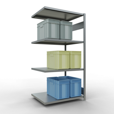 Die einzelnen Fachböden können im Raster von 25 mm in der Höhe verstellt werden. Sollte die angegebene, gleichmäßig verteilte Fachlast i.H.v. 330 kg je Fach nicht ausreichen, können Sie die Fachböden mit Verstärkungsunterzügen ausstatten und so die Tragkraft erhöhen. Bitte beachten Sie dabei allerdings die maximal zulässige Feldlast.