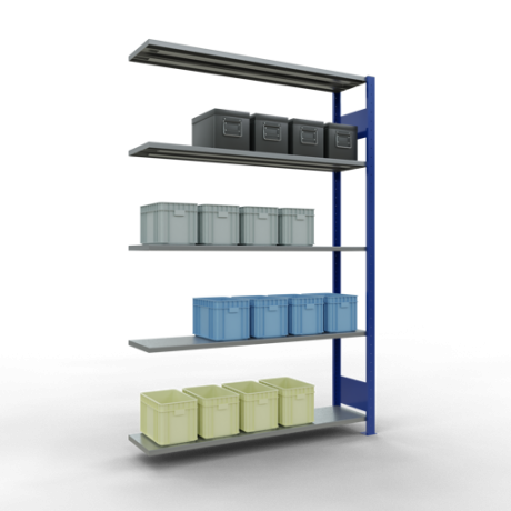 Schwerlastregal vom Markenhersteller SCHULTE Lagertechnik. Das Schwerlastregal vom Typ MULTIplus ist das wohl bekannteste Steckregal auf dem deutschen Markt und wird oftmals, in Lagern, an Produktionslinien, in Archiven, oder auch in privaten Haushalten verwendet. Das hier angebotene Schwerlastregal Anbauregal mit der Artikelnummer 12735-130-LR-B-M wird in 2000 mm Höhe, 1300 mm Breite und 300 mm Tiefe geliefert. Es ist mit 5 Fachebenen ausgestattet und kann je Ebene mit 150 kg belastet werden. Um die langfristige Nutzung zu gewährleisten sind die Bauteile in der Farbe RAL 5010 enzianblau/verzinkt. Das Schwerlastregal ist für die Beidseitige Bedienung ausgelegt.