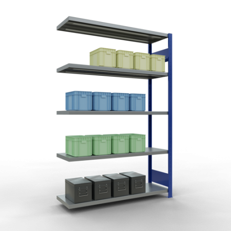 Schwerlastregal vom Markenhersteller SCHULTE Lagertechnik. Das Schwerlastregal vom Typ MULTIplus ist das wohl bekannteste Steckregal auf dem deutschen Markt und wird oftmals, in Lagern, an Produktionslinien, in Archiven, oder auch in privaten Haushalten verwendet. Das hier angebotene Schwerlastregal Anbauregal mit der Artikelnummer 12945-130-LR-B wird in 2000 mm Höhe, 1300 mm Breite und 400 mm Tiefe geliefert. Es ist mit 5 Fachebenen ausgestattet und kann je Ebene mit 250 kg belastet werden. Um die langfristige Nutzung zu gewährleisten sind die Bauteile in der Farbe RAL 5010 enzianblau/verzinkt. Das Schwerlastregal ist für die Beidseitige Bedienung ausgelegt.
