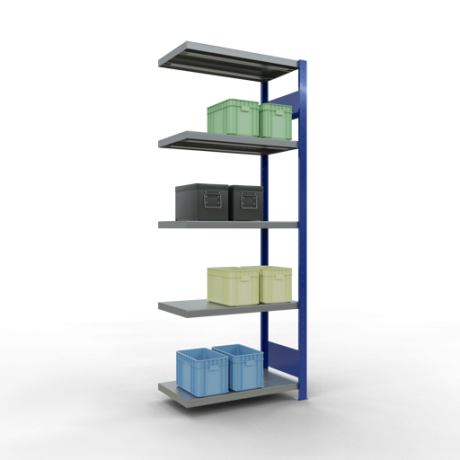 Schwerlastregal vom Markenhersteller SCHULTE Lagertechnik. Das Schwerlastregal vom Typ MULTIplus ist das wohl bekannteste Steckregal auf dem deutschen Markt und wird oftmals, in Lagern, an Produktionslinien, in Archiven, oder auch in privaten Haushalten verwendet. Das hier angebotene Schwerlastregal Anbauregal mit der Artikelnummer 12945-75-LR-B-M wird in 2000 mm Höhe, 750 mm Breite und 400 mm Tiefe geliefert. Es ist mit 5 Fachebenen ausgestattet und kann je Ebene mit 250 kg belastet werden. Um die langfristige Nutzung zu gewährleisten sind die Bauteile in der Farbe RAL 5010 enzianblau/verzinkt. Das Schwerlastregal ist für die Beidseitige Bedienung ausgelegt.
