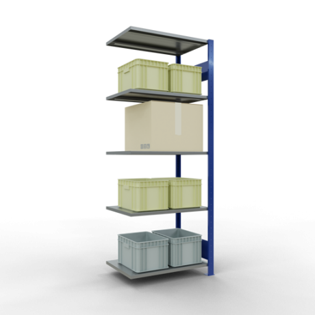 Die einzelnen Fachböden können im Raster von 25 mm in der Höhe verstellt werden. Sollte die angegebene, gleichmäßig verteilte Fachlast i.H.v. 150 kg je Fach nicht ausreichen, können Sie die Fachböden mit Verstärkungsunterzügen ausstatten und so die Tragkraft erhöhen. Bitte beachten Sie dabei allerdings die maximal zulässige Feldlast.