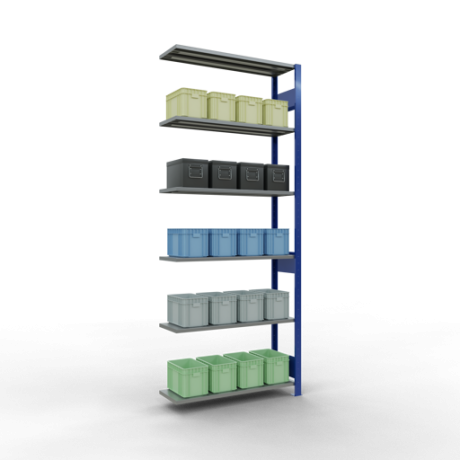 Schwerlastregal vom Markenhersteller SCHULTE Lagertechnik. Das Schwerlastregal vom Typ MULTIplus ist das wohl bekannteste Steckregal auf dem deutschen Markt und wird oftmals, in Lagern, an Produktionslinien, in Archiven, oder auch in privaten Haushalten verwendet. Das hier angebotene Schwerlastregal Anbauregal mit der Artikelnummer 12736-LR-B-M wird in 2500 mm Höhe, 1000 mm Breite und 300 mm Tiefe geliefert. Es ist mit 6 Fachebenen ausgestattet und kann je Ebene mit 150 kg belastet werden. Um die langfristige Nutzung zu gewährleisten sind die Bauteile in der Farbe RAL 5010 enzianblau/verzinkt. Das Schwerlastregal ist für die Beidseitige Bedienung ausgelegt.