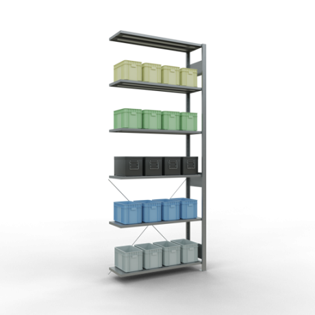 Die einzelnen Fachböden können im Raster von 25 mm in der Höhe verstellt werden. Sollte die angegebene, gleichmäßig verteilte Fachlast i.H.v. 85 kg je Fach nicht ausreichen, können Sie die Fachböden mit Verstärkungsunterzügen ausstatten und so die Tragkraft erhöhen. Bitte beachten Sie dabei allerdings die maximal zulässige Feldlast.