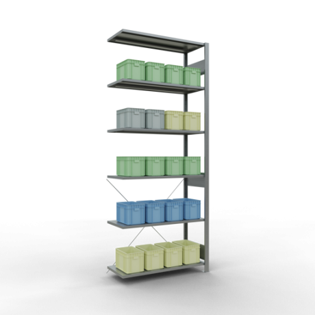 Die einzelnen Fachböden können im Raster von 25 mm in der Höhe verstellt werden. Sollte die angegebene, gleichmäßig verteilte Fachlast i.H.v. 150 kg je Fach nicht ausreichen, können Sie die Fachböden mit Verstärkungsunterzügen ausstatten und so die Tragkraft erhöhen. Bitte beachten Sie dabei allerdings die maximal zulässige Feldlast.