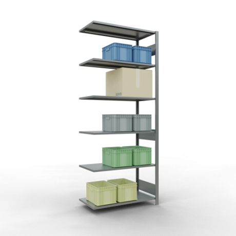 Die einzelnen Fachböden können im Raster von 25 mm in der Höhe verstellt werden. Sollte die angegebene, gleichmäßig verteilte Fachlast i.H.v. 150 kg je Fach nicht ausreichen, können Sie die Fachböden mit Verstärkungsunterzügen ausstatten und so die Tragkraft erhöhen. Bitte beachten Sie dabei allerdings die maximal zulässige Feldlast.