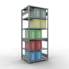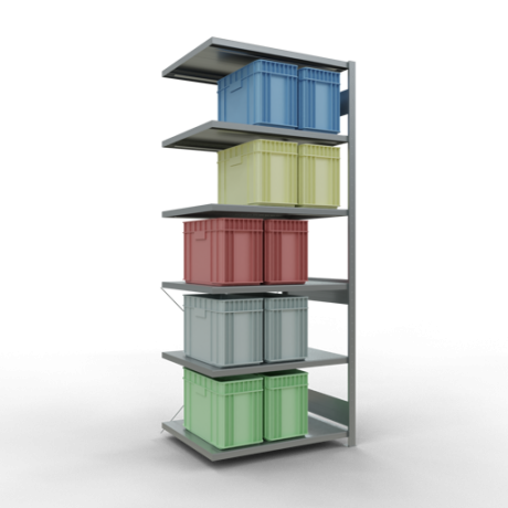 Die einzelnen Fachböden können im Raster von 25 mm in der Höhe verstellt werden. Sollte die angegebene, gleichmäßig verteilte Fachlast i.H.v. 330 kg je Fach nicht ausreichen, können Sie die Fachböden mit Verstärkungsunterzügen ausstatten und so die Tragkraft erhöhen. Bitte beachten Sie dabei allerdings die maximal zulässige Feldlast.