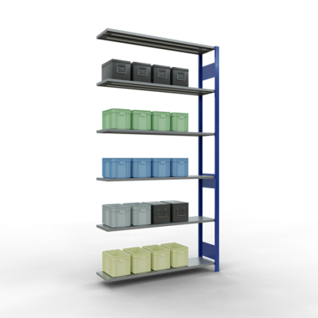 Schwerlastregal vom Markenhersteller SCHULTE Lagertechnik. Das Schwerlastregal vom Typ MULTIplus ist das wohl bekannteste Steckregal auf dem deutschen Markt und wird oftmals, in Lagern, an Produktionslinien, in Archiven, oder auch in privaten Haushalten verwendet. Das hier angebotene Schwerlastregal Anbauregal mit der Artikelnummer 12736-130-LR-B wird in 2500 mm Höhe, 1300 mm Breite und 300 mm Tiefe geliefert. Es ist mit 6 Fachebenen ausgestattet und kann je Ebene mit 150 kg belastet werden. Um die langfristige Nutzung zu gewährleisten sind die Bauteile in der Farbe RAL 5010 enzianblau/verzinkt. Das Schwerlastregal ist für die Beidseitige Bedienung ausgelegt.