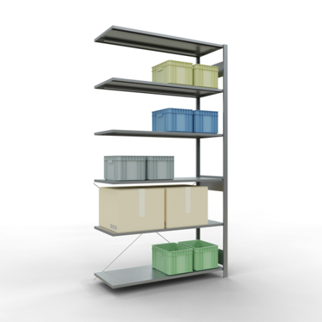 Die einzelnen Fachböden können im Raster von 25 mm in der Höhe verstellt werden. Sollte die angegebene, gleichmäßig verteilte Fachlast i.H.v. 150 kg je Fach nicht ausreichen, können Sie die Fachböden mit Verstärkungsunterzügen ausstatten und so die Tragkraft erhöhen. Bitte beachten Sie dabei allerdings die maximal zulässige Feldlast.
