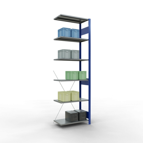 Schwerlastregal vom Markenhersteller SCHULTE Lagertechnik. Das Schwerlastregal vom Typ MULTIplus ist das wohl bekannteste Steckregal auf dem deutschen Markt und wird oftmals, in Lagern, an Produktionslinien, in Archiven, oder auch in privaten Haushalten verwendet. Das hier angebotene Schwerlastregal Anbauregal mit der Artikelnummer 12746-75-B-M wird in 2500 mm Höhe, 750 mm Breite und 400 mm Tiefe geliefert. Es ist mit 6 Fachebenen ausgestattet und kann je Ebene mit 150 kg belastet werden. Um die langfristige Nutzung zu gewährleisten sind die Bauteile in der Farbe RAL 5010 enzianblau/verzinkt. Das Schwerlastregal ist für die Einseitige Bedienung ausgelegt.