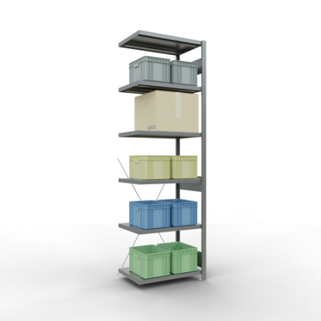 Die einzelnen Fachböden können im Raster von 25 mm in der Höhe verstellt werden. Sollte die angegebene, gleichmäßig verteilte Fachlast i.H.v. 250 kg je Fach nicht ausreichen, können Sie die Fachböden mit Verstärkungsunterzügen ausstatten und so die Tragkraft erhöhen. Bitte beachten Sie dabei allerdings die maximal zulässige Feldlast.