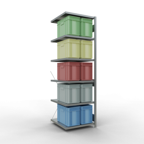 Die einzelnen Fachböden können im Raster von 25 mm in der Höhe verstellt werden. Sollte die angegebene, gleichmäßig verteilte Fachlast i.H.v. 250 kg je Fach nicht ausreichen, können Sie die Fachböden mit Verstärkungsunterzügen ausstatten und so die Tragkraft erhöhen. Bitte beachten Sie dabei allerdings die maximal zulässige Feldlast.