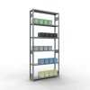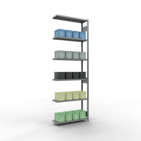 Die einzelnen Fachböden können im Raster von 25 mm in der Höhe verstellt werden. Sollte die angegebene, gleichmäßig verteilte Fachlast i.H.v. 250 kg je Fach nicht ausreichen, können Sie die Fachböden mit Verstärkungsunterzügen ausstatten und so die Tragkraft erhöhen. Bitte beachten Sie dabei allerdings die maximal zulässige Feldlast.