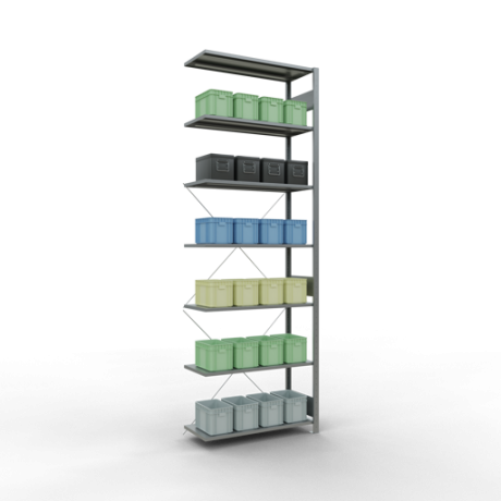 Die einzelnen Fachböden können im Raster von 25 mm in der Höhe verstellt werden. Sollte die angegebene, gleichmäßig verteilte Fachlast i.H.v. 85 kg je Fach nicht ausreichen, können Sie die Fachböden mit Verstärkungsunterzügen ausstatten und so die Tragkraft erhöhen. Bitte beachten Sie dabei allerdings die maximal zulässige Feldlast.