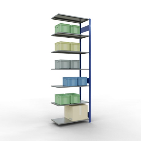 Die einzelnen Fachböden können im Raster von 25 mm in der Höhe verstellt werden. Sollte die angegebene, gleichmäßig verteilte Fachlast i.H.v. 85 kg je Fach nicht ausreichen, können Sie die Fachböden mit Verstärkungsunterzügen ausstatten und so die Tragkraft erhöhen. Bitte beachten Sie dabei allerdings die maximal zulässige Feldlast.