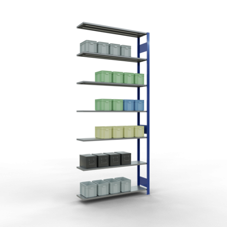 Schwerlastregal vom Markenhersteller SCHULTE Lagertechnik. Das Schwerlastregal vom Typ MULTIplus ist das wohl bekannteste Steckregal auf dem deutschen Markt und wird oftmals, in Lagern, an Produktionslinien, in Archiven, oder auch in privaten Haushalten verwendet. Das hier angebotene Schwerlastregal Anbauregal mit der Artikelnummer 12737-130-LR-B wird in 3000 mm Höhe, 1300 mm Breite und 300 mm Tiefe geliefert. Es ist mit 7 Fachebenen ausgestattet und kann je Ebene mit 150 kg belastet werden. Um die langfristige Nutzung zu gewährleisten sind die Bauteile in der Farbe RAL 5010 enzianblau/verzinkt. Das Schwerlastregal ist für die Beidseitige Bedienung ausgelegt.