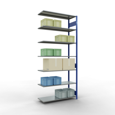 Die einzelnen Fachböden können im Raster von 25 mm in der Höhe verstellt werden. Sollte die angegebene, gleichmäßig verteilte Fachlast i.H.v. 150 kg je Fach nicht ausreichen, können Sie die Fachböden mit Verstärkungsunterzügen ausstatten und so die Tragkraft erhöhen. Bitte beachten Sie dabei allerdings die maximal zulässige Feldlast.