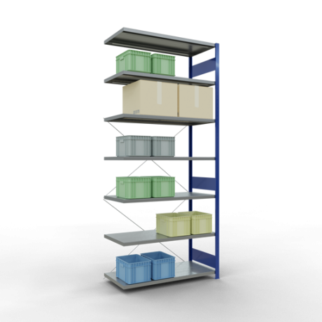 Die einzelnen Fachböden können im Raster von 25 mm in der Höhe verstellt werden. Sollte die angegebene, gleichmäßig verteilte Fachlast i.H.v. 250 kg je Fach nicht ausreichen, können Sie die Fachböden mit Verstärkungsunterzügen ausstatten und so die Tragkraft erhöhen. Bitte beachten Sie dabei allerdings die maximal zulässige Feldlast.