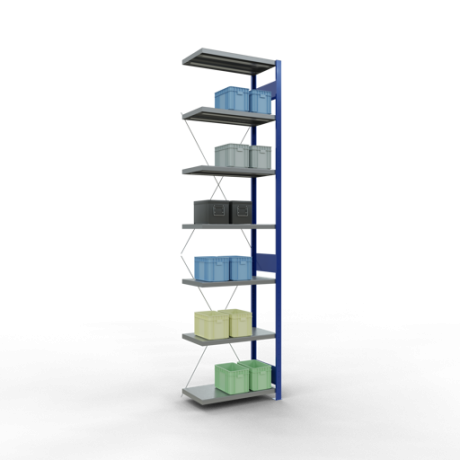 Schwerlastregal vom Markenhersteller SCHULTE Lagertechnik. Das Schwerlastregal vom Typ MULTIplus ist das wohl bekannteste Steckregal auf dem deutschen Markt und wird oftmals, in Lagern, an Produktionslinien, in Archiven, oder auch in privaten Haushalten verwendet. Das hier angebotene Schwerlastregal Anbauregal mit der Artikelnummer 12947-75-B wird in 3000 mm Höhe, 750 mm Breite und 400 mm Tiefe geliefert. Es ist mit 7 Fachebenen ausgestattet und kann je Ebene mit 250 kg belastet werden. Um die langfristige Nutzung zu gewährleisten sind die Bauteile in der Farbe RAL 5010 enzianblau/verzinkt. Das Schwerlastregal ist für die Einseitige Bedienung ausgelegt.