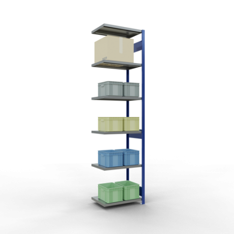 Schwerlastregal vom Markenhersteller SCHULTE Lagertechnik. Das Schwerlastregal vom Typ MULTIplus ist das wohl bekannteste Steckregal auf dem deutschen Markt und wird oftmals, in Lagern, an Produktionslinien, in Archiven, oder auch in privaten Haushalten verwendet. Das hier angebotene Schwerlastregal Anbauregal mit der Artikelnummer 12957-75-LR-B wird in 3000 mm Höhe, 750 mm Breite und 500 mm Tiefe geliefert. Es ist mit 7 Fachebenen ausgestattet und kann je Ebene mit 250 kg belastet werden. Um die langfristige Nutzung zu gewährleisten sind die Bauteile in der Farbe RAL 5010 enzianblau/verzinkt. Das Schwerlastregal ist für die Beidseitige Bedienung ausgelegt.