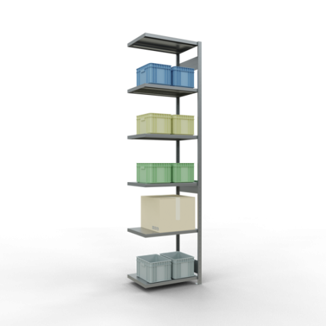 Die einzelnen Fachböden können im Raster von 25 mm in der Höhe verstellt werden. Sollte die angegebene, gleichmäßig verteilte Fachlast i.H.v. 250 kg je Fach nicht ausreichen, können Sie die Fachböden mit Verstärkungsunterzügen ausstatten und so die Tragkraft erhöhen. Bitte beachten Sie dabei allerdings die maximal zulässige Feldlast.