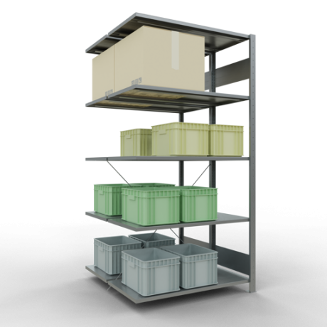 Die einzelnen Fachböden können im Raster von 25 mm in der Höhe verstellt werden. Sollte die angegebene, gleichmäßig verteilte Fachlast i.H.v. 150 kg je Fach nicht ausreichen, können Sie die Fachböden mit Verstärkungsunterzügen ausstatten und so die Tragkraft erhöhen. Bitte beachten Sie dabei allerdings die maximal zulässige Feldlast.