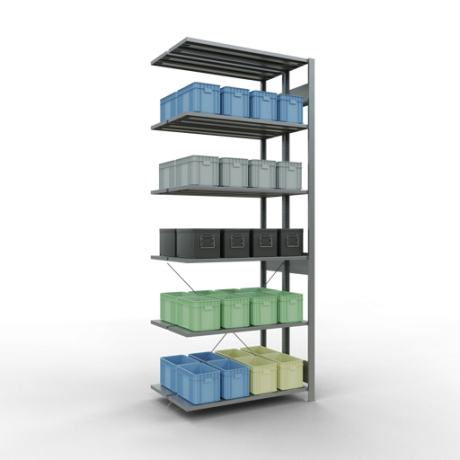 Die einzelnen Fachböden können im Raster von 25 mm in der Höhe verstellt werden. Sollte die angegebene, gleichmäßig verteilte Fachlast i.H.v. 150 kg je Fach nicht ausreichen, können Sie die Fachböden mit Verstärkungsunterzügen ausstatten und so die Tragkraft erhöhen. Bitte beachten Sie dabei allerdings die maximal zulässige Feldlast.