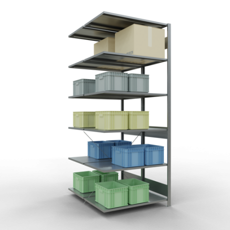 Die einzelnen Fachböden können im Raster von 25 mm in der Höhe verstellt werden. Sollte die angegebene, gleichmäßig verteilte Fachlast i.H.v. 150 kg je Fach nicht ausreichen, können Sie die Fachböden mit Verstärkungsunterzügen ausstatten und so die Tragkraft erhöhen. Bitte beachten Sie dabei allerdings die maximal zulässige Feldlast.
