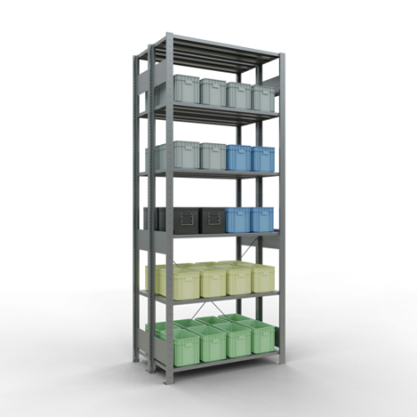 Die einzelnen Fachböden können im Raster von 25 mm in der Höhe verstellt werden. Sollte die angegebene, gleichmäßig verteilte Fachlast i.H.v. 150 kg je Fach nicht ausreichen, können Sie die Fachböden mit Verstärkungsunterzügen ausstatten und so die Tragkraft erhöhen. Bitte beachten Sie dabei allerdings die maximal zulässige Feldlast.