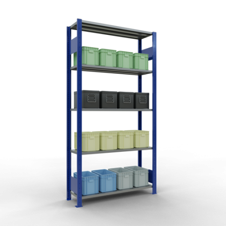 Schwerlastregal vom Markenhersteller SCHULTE Lagertechnik. Das Schwerlastregal vom Typ MULTIplus ist das wohl bekannteste Steckregal auf dem deutschen Markt und wird oftmals, in Lagern, an Produktionslinien, in Archiven, oder auch in privaten Haushalten verwendet. Das hier angebotene Schwerlastregal Grundregal mit der Artikelnummer 12730-LR-B-M wird in 2000 mm Höhe, 1000 mm Breite und 300 mm Tiefe geliefert. Es ist mit 5 Fachebenen ausgestattet und kann je Ebene mit 150 kg belastet werden. Um die langfristige Nutzung zu gewährleisten sind die Bauteile in der Farbe RAL 5010 enzianblau/verzinkt. Das Schwerlastregal ist für die Beidseitige Bedienung ausgelegt.