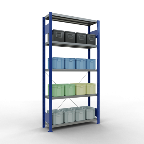 Schwerlastregal vom Markenhersteller SCHULTE Lagertechnik. Das Schwerlastregal vom Typ MULTIplus ist das wohl bekannteste Steckregal auf dem deutschen Markt und wird oftmals, in Lagern, an Produktionslinien, in Archiven, oder auch in privaten Haushalten verwendet. Das hier angebotene Schwerlastregal Grundregal mit der Artikelnummer 12930-B-M wird in 2000 mm Höhe, 1000 mm Breite und 300 mm Tiefe geliefert. Es ist mit 5 Fachebenen ausgestattet und kann je Ebene mit 250 kg belastet werden. Um die langfristige Nutzung zu gewährleisten sind die Bauteile in der Farbe RAL 5010 enzianblau/verzinkt. Das Schwerlastregal ist für die Einseitige Bedienung ausgelegt.