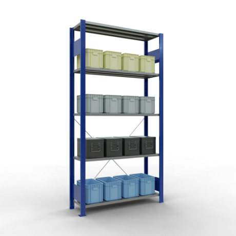 Schwerlastregal vom Markenhersteller SCHULTE Lagertechnik. Das Schwerlastregal vom Typ MULTIplus ist das wohl bekannteste Steckregal auf dem deutschen Markt und wird oftmals, in Lagern, an Produktionslinien, in Archiven, oder auch in privaten Haushalten verwendet. Das hier angebotene Schwerlastregal Grundregal mit der Artikelnummer 12630-B wird in 2000 mm Höhe, 1000 mm Breite und 300 mm Tiefe geliefert. Es ist mit 5 Fachebenen ausgestattet und kann je Ebene mit 150 kg belastet werden. Um die langfristige Nutzung zu gewährleisten sind die Bauteile in der Farbe RAL 5010 enzianblau/verzinkt. Das Schwerlastregal ist für die Einseitige Bedienung ausgelegt.
