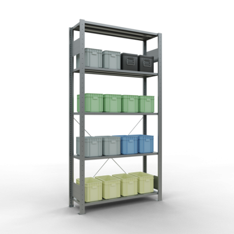 Die einzelnen Fachböden können im Raster von 25 mm in der Höhe verstellt werden. Sollte die angegebene, gleichmäßig verteilte Fachlast i.H.v. 150 kg je Fach nicht ausreichen, können Sie die Fachböden mit Verstärkungsunterzügen ausstatten und so die Tragkraft erhöhen. Bitte beachten Sie dabei allerdings die maximal zulässige Feldlast.