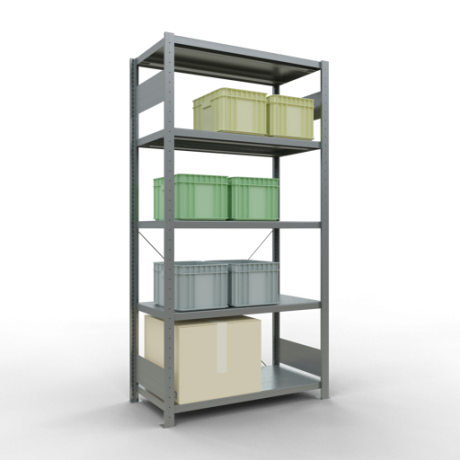 Die einzelnen Fachböden können im Raster von 25 mm in der Höhe verstellt werden. Sollte die angegebene, gleichmäßig verteilte Fachlast i.H.v. 250 kg je Fach nicht ausreichen, können Sie die Fachböden mit Verstärkungsunterzügen ausstatten und so die Tragkraft erhöhen. Bitte beachten Sie dabei allerdings die maximal zulässige Feldlast.