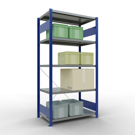 Schwerlastregal vom Markenhersteller SCHULTE Lagertechnik. Das Schwerlastregal vom Typ MULTIplus ist das wohl bekannteste Steckregal auf dem deutschen Markt und wird oftmals, in Lagern, an Produktionslinien, in Archiven, oder auch in privaten Haushalten verwendet. Das hier angebotene Schwerlastregal Grundregal mit der Artikelnummer 12960-B wird in 2000 mm Höhe, 1000 mm Breite und 600 mm Tiefe geliefert. Es ist mit 5 Fachebenen ausgestattet und kann je Ebene mit 250 kg belastet werden. Um die langfristige Nutzung zu gewährleisten sind die Bauteile in der Farbe RAL 5010 enzianblau/verzinkt. Das Schwerlastregal ist für die Einseitige Bedienung ausgelegt.