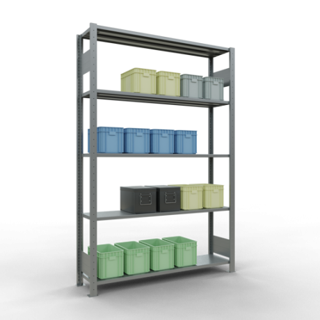 Die einzelnen Fachböden können im Raster von 25 mm in der Höhe verstellt werden. Sollte die angegebene, gleichmäßig verteilte Fachlast i.H.v. 150 kg je Fach nicht ausreichen, können Sie die Fachböden mit Verstärkungsunterzügen ausstatten und so die Tragkraft erhöhen. Bitte beachten Sie dabei allerdings die maximal zulässige Feldlast.