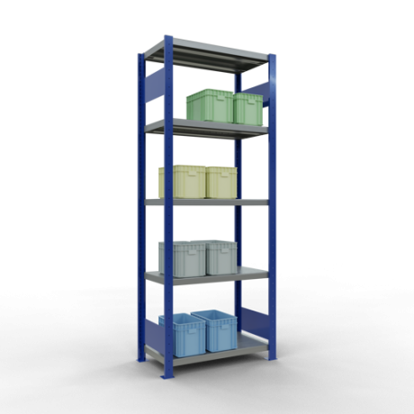 Schwerlastregal vom Markenhersteller SCHULTE Lagertechnik. Das Schwerlastregal vom Typ MULTIplus ist das wohl bekannteste Steckregal auf dem deutschen Markt und wird oftmals, in Lagern, an Produktionslinien, in Archiven, oder auch in privaten Haushalten verwendet. Das hier angebotene Schwerlastregal Grundregal mit der Artikelnummer 12940-75-LR-B-M wird in 2000 mm Höhe, 750 mm Breite und 400 mm Tiefe geliefert. Es ist mit 5 Fachebenen ausgestattet und kann je Ebene mit 250 kg belastet werden. Um die langfristige Nutzung zu gewährleisten sind die Bauteile in der Farbe RAL 5010 enzianblau/verzinkt. Das Schwerlastregal ist für die Beidseitige Bedienung ausgelegt.