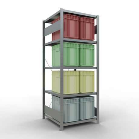 Die einzelnen Fachböden können im Raster von 25 mm in der Höhe verstellt werden. Sollte die angegebene, gleichmäßig verteilte Fachlast i.H.v. 250 kg je Fach nicht ausreichen, können Sie die Fachböden mit Verstärkungsunterzügen ausstatten und so die Tragkraft erhöhen. Bitte beachten Sie dabei allerdings die maximal zulässige Feldlast.