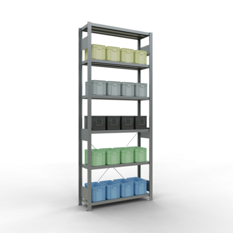Schwerlastregal vom Markenhersteller SCHULTE Lagertechnik. Das Schwerlastregal vom Typ MULTIplus ist das wohl bekannteste Steckregal auf dem deutschen Markt und wird oftmals, in Lagern, an Produktionslinien, in Archiven, oder auch in privaten Haushalten verwendet. Das hier angebotene Schwerlastregal Grundregal mit der Artikelnummer 12931-M wird in 2500 mm Höhe, 1000 mm Breite und 300 mm Tiefe geliefert. Es ist mit 6 Fachebenen ausgestattet und kann je Ebene mit 250 kg belastet werden. Um die langfristige Nutzung zu gewährleisten sind die Bauteile in der Farbe verzinkt. Das Schwerlastregal ist für die Einseitige Bedienung ausgelegt.