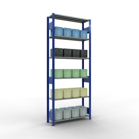 Schwerlastregal vom Markenhersteller SCHULTE Lagertechnik. Das Schwerlastregal vom Typ MULTIplus ist das wohl bekannteste Steckregal auf dem deutschen Markt und wird oftmals, in Lagern, an Produktionslinien, in Archiven, oder auch in privaten Haushalten verwendet. Das hier angebotene Schwerlastregal Grundregal mit der Artikelnummer 13131-LR-B-M wird in 2500 mm Höhe, 1000 mm Breite und 300 mm Tiefe geliefert. Es ist mit 6 Fachebenen ausgestattet und kann je Ebene mit 85 kg belastet werden. Um die langfristige Nutzung zu gewährleisten sind die Bauteile in der Farbe RAL 5010 enzianblau/verzinkt. Das Schwerlastregal ist für die Beidseitige Bedienung ausgelegt.